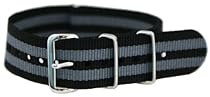 This is a 20MM James Bond Black / Grey nylon NATO Ballistics Military Style Watch Band / Strap. These watch bands are made from the highest quality nylon material. It comes with a 100% Stainless steel watch buckle! Size is 20mm wide and 11 Inches long. These fit all straight end watches that require a 20mm watch band. Mostly used for Military combat, but also used for the everyday fasion as well as Divers.